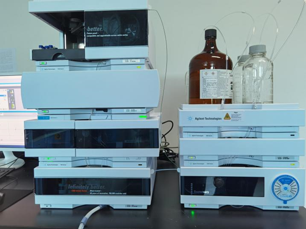 仪器简介:Agilent 1100-VWD配备四元泵、自动进样器(样品盘可容纳100个2ml样品瓶,进样量为0.1µL-100µL)、柱温箱、紫外检测器(UVD, G1175AR),另外搭配安捷伦荧光检测器(FLD, G7121A),激发单色器:200nm-1200nm,发射单色器:200nm-1200nm,带宽20nm。